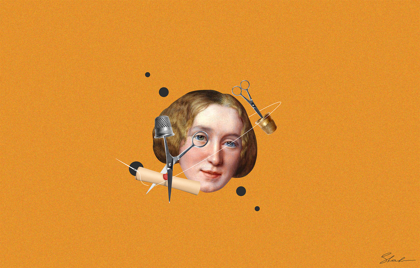 Naturally, after reading, I felt inspired to create a collage in which George Eliot breaks old rules, scrolls, and regulations.